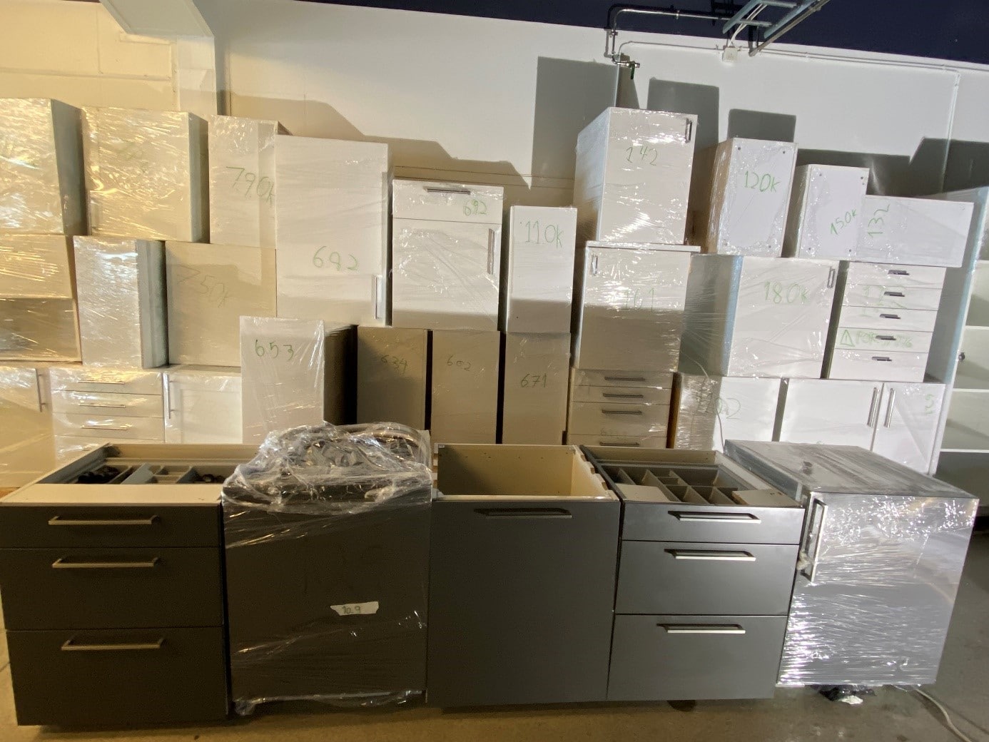 Kjøkken for ombruk med ni deler. Vi har skap til vask, skuffer, overskap, skap med vifte, kjøleskap og oppvaskmaskin. Småskader forekommer, men frontene er hele og pene. Benkeplate mangler.
