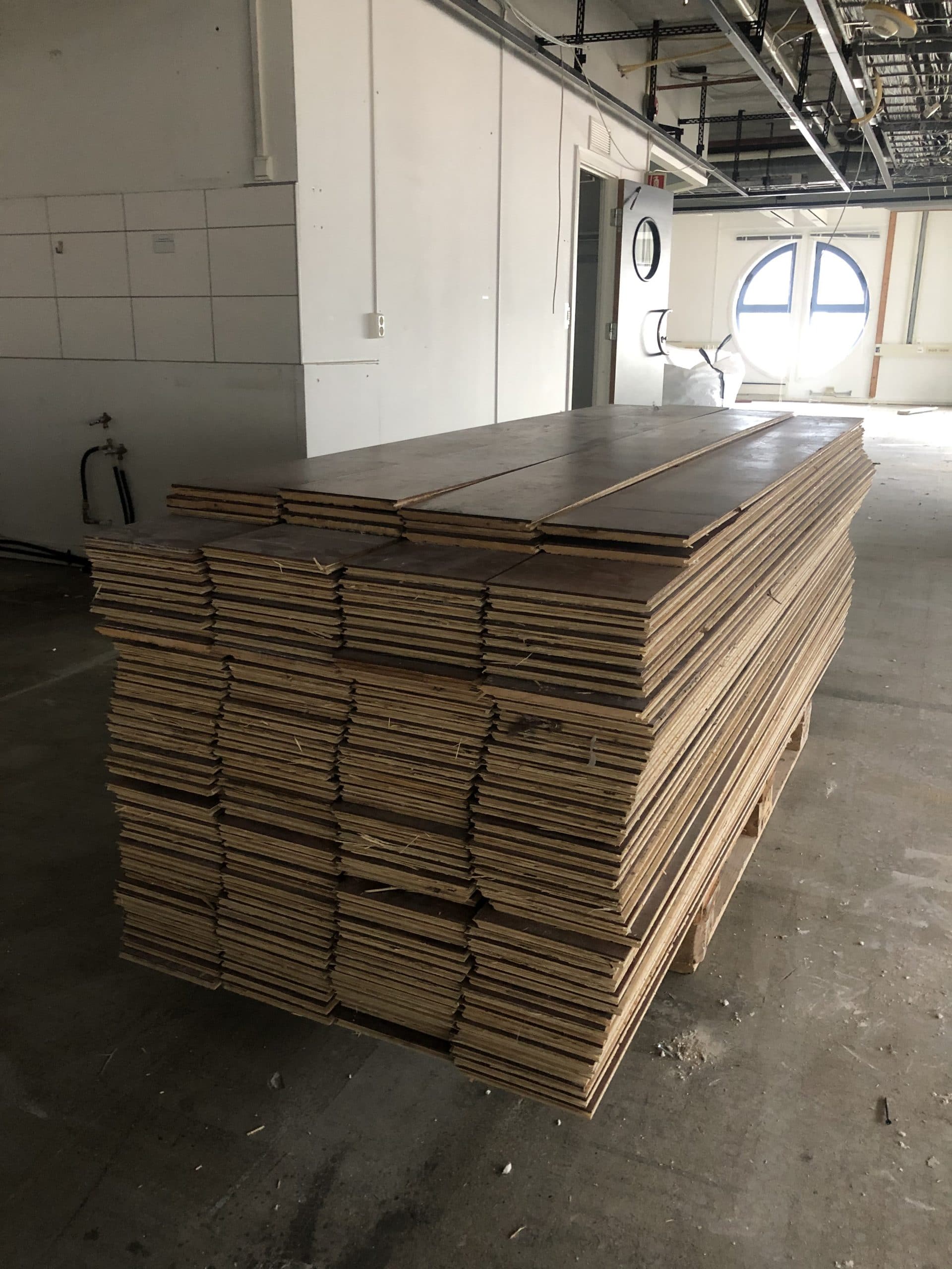 Ca. 40 kvadratmeter parkett, sannsynligvis av kirsebærtre eller bøk.